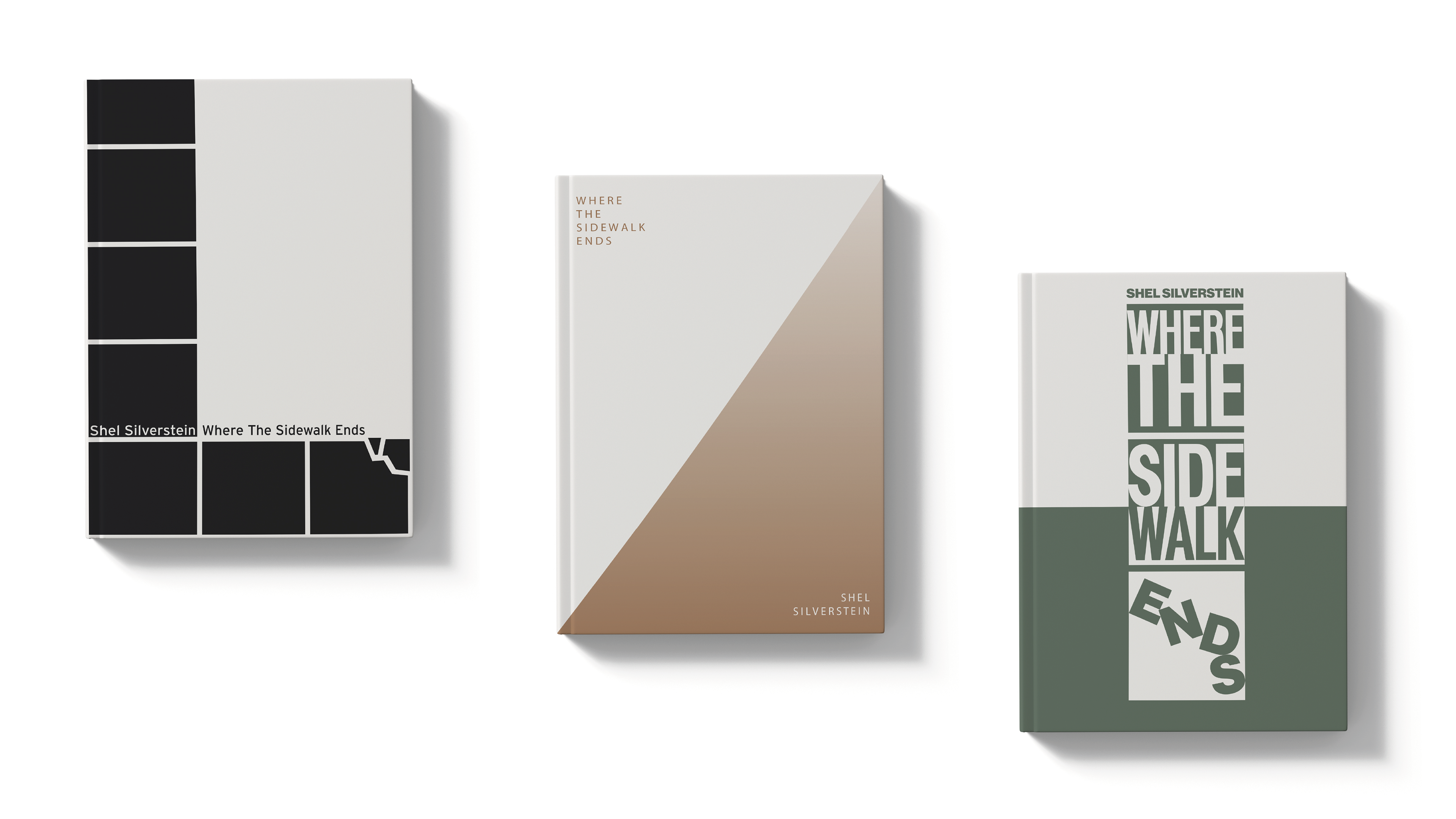 Three different book cover redesigns for the children's book "Where the Sidewalk Ends" by Shel Silverstein.